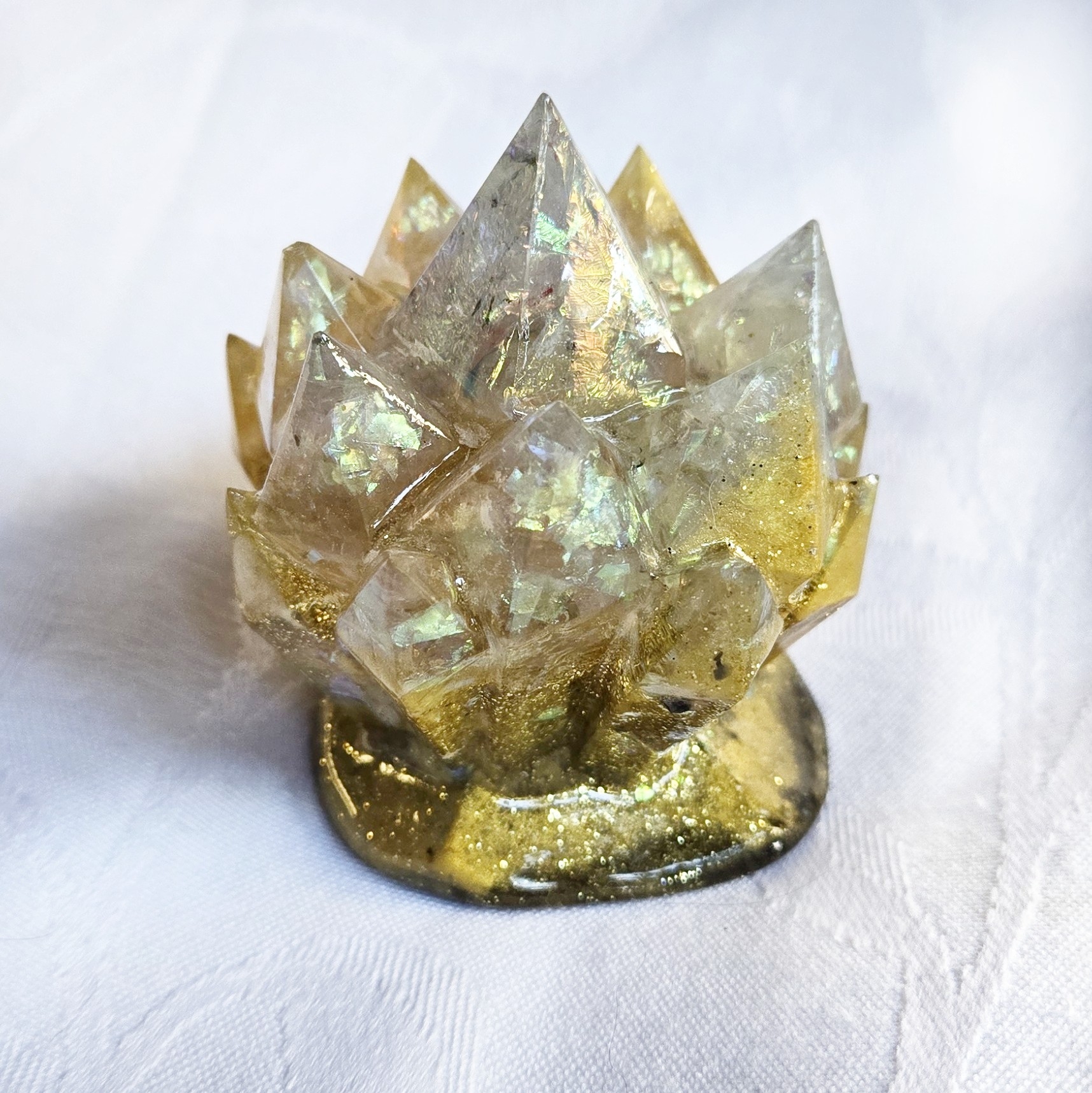 Confeccionado con orgón: resina, metal aluminio y cristales.