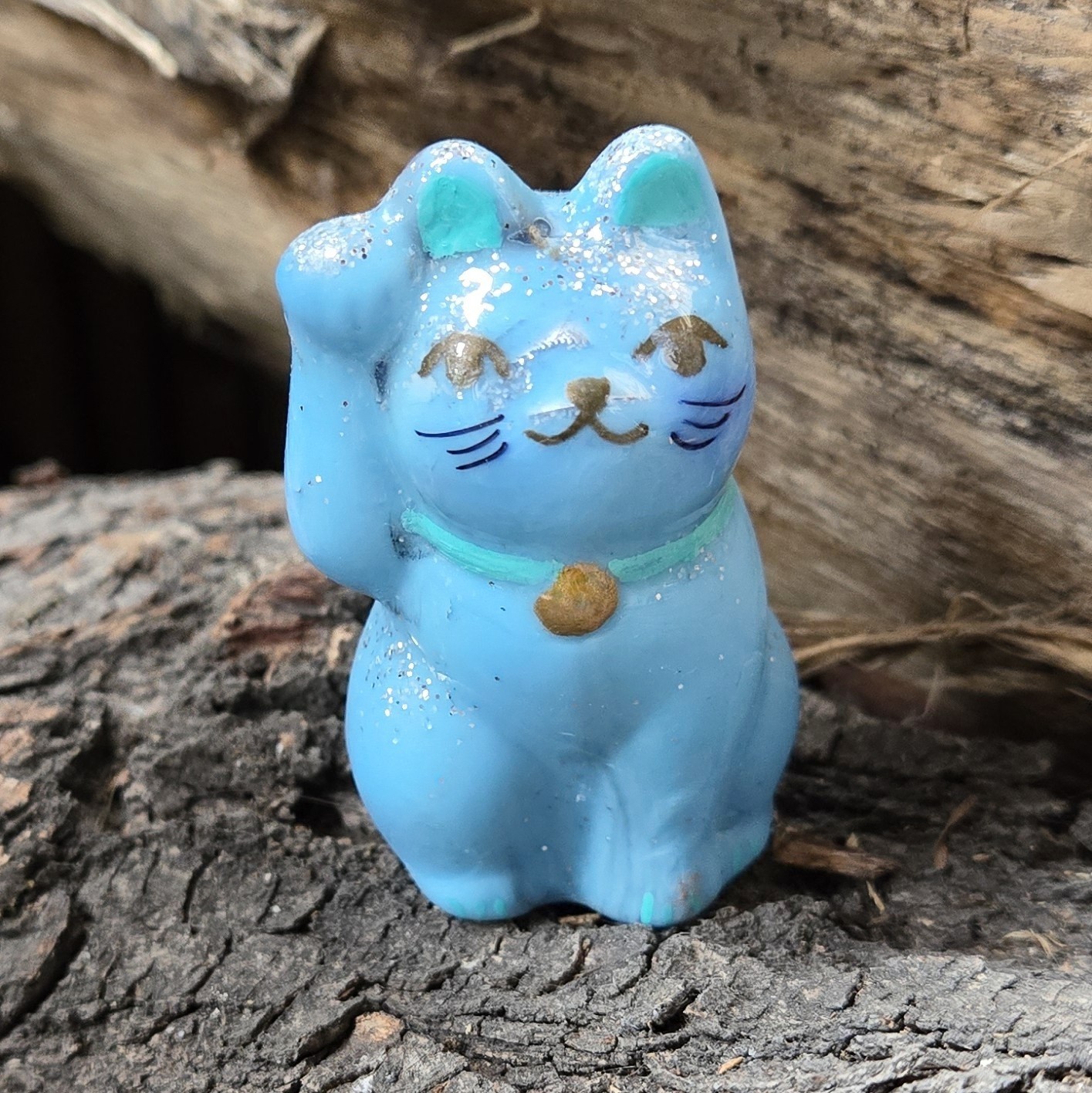 Gato confeccionado con orgón: resina, cristales y metal acero.