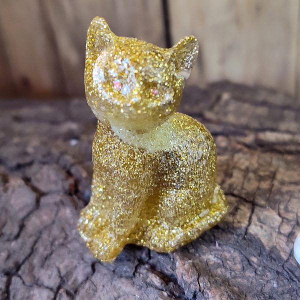 Gatito Protector confeccionado con resina cristal y viruta de aluminio.